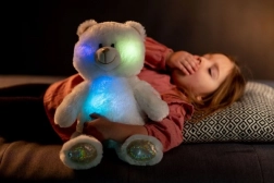 Medvedík svieti a mení farby v tme pre pocit bezpečia a útulnosti.