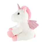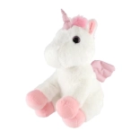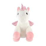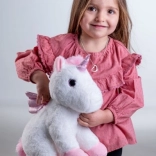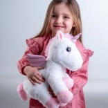 Plyšový jednorožec s jemným bielym kožušinou a ružovými detailmi je ideálny na maznanie a útechu.