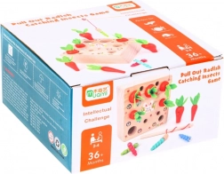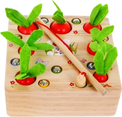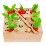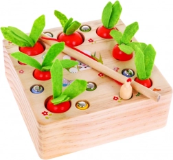 Drevená hra s mrkvičkami je navrhnutá tak, aby podnecovala zvedavosť a podporovala rozvoj jemnej motoriky a koordinácie ruky a oka. Deti sa môžu naučiť rozpoznávať tvary a farby a tiež si zlepšiť svoje zručnosti s magnetickou udicou. Táto hra je ideálna na samostatnú hru i na hranie v skupine. Pomocou magnetickej udice musia deti odstrániť všetky červíky a potom pozberať mrkve, aby chránili rastúcu zeleninu.