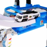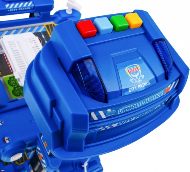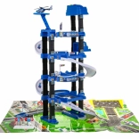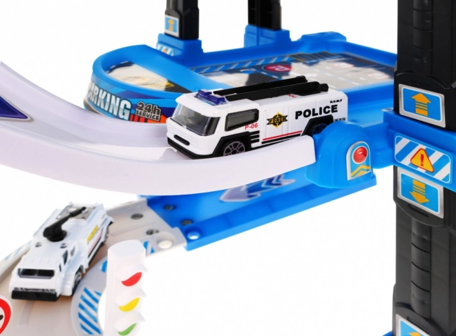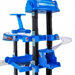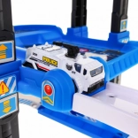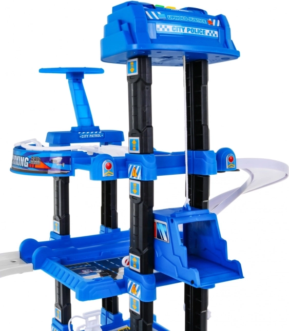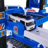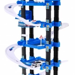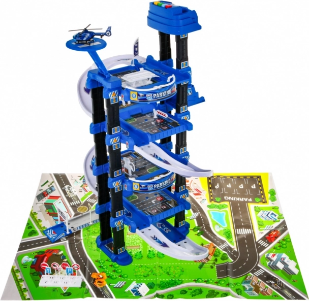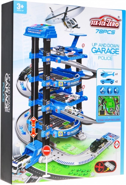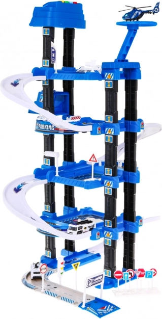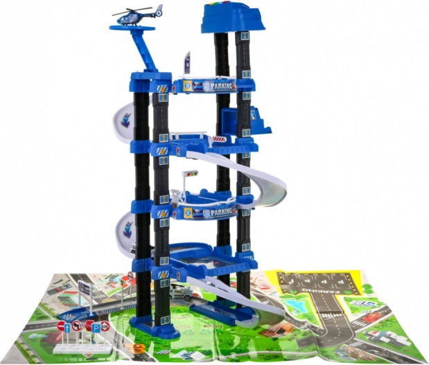 | | Veľké viacúrovňové policajné parkovisko je vhodné pre deti od 3 rokov. Parkovisko sa skladá z piatich úrovní, na ktoré sa dá dostať výťahom alebo šmýkačkou. Na ceste z úrovne na úroveň sa dieťa stretne s mnohými atrakciami. Na spodnej úrovni sa nachádza dráha, po ktorej môžu jazdiť vozidlá, vyššie na ďalších úrovniach sú parkovacie miesta pre vozidlá. Úplne hore je pristávacia plocha pre vrtuľník a výťah s blikajúcimi svetlami a zvukmi, ktorý jazdí hore a dolu. Súčasťou sady sú dve vozidlá, vrtuľník, dopravné značky a tiež podložka s ulicami a budovami pre parkovisko. Hračka je napájaná 3 x AA 1,5 V batériami, ktoré sú v sade zabalené. |