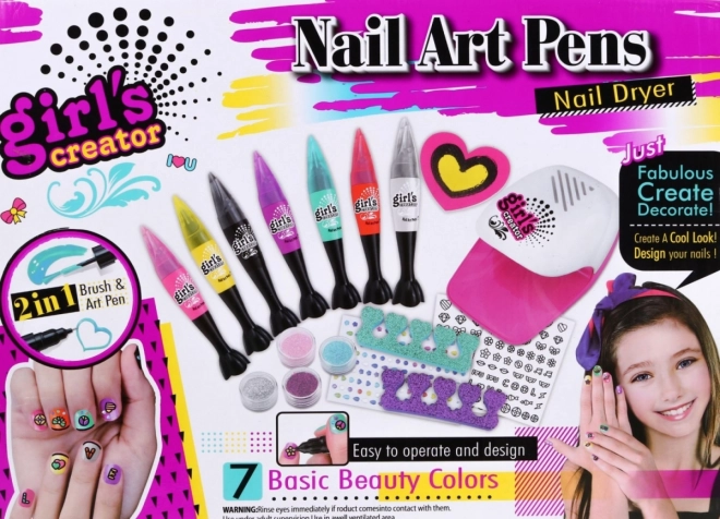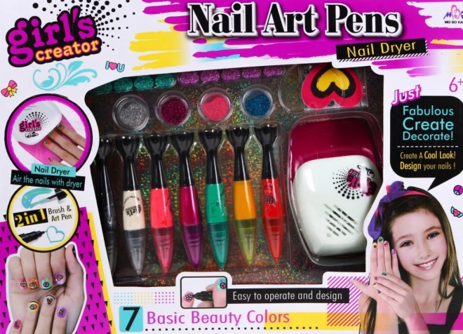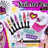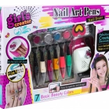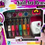 Obsahuje sušičku na nechty napájanú batériami, dekoratívne kamienky, množstvo nálepiek a ďalšie pomôcky pre nechtové umenie.