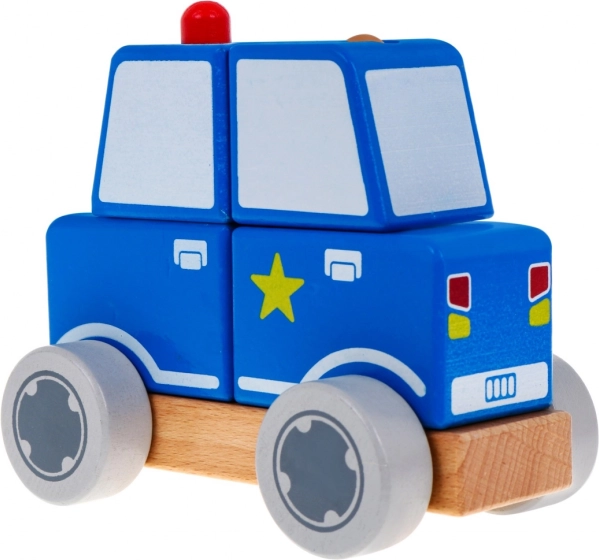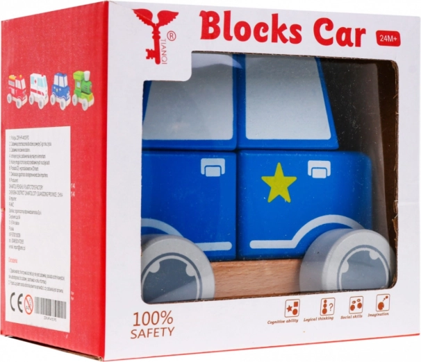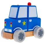 Roztomilé drevené policajné autíčko pre deti od 2 rokov rozvíja jemnú motoriku, koordináciu oko–ruka a logické myslenie. Skladá sa z podvozka a štyroch kociek, ktoré sa nasadzujú na drevené kolíky a vytvárajú podobu policajného vozidla. Vyrobené z kvalitného dreva a farbené netoxickými farbami pre bezpečné hranie.
