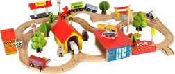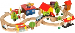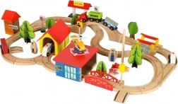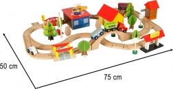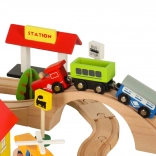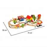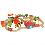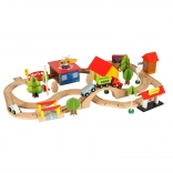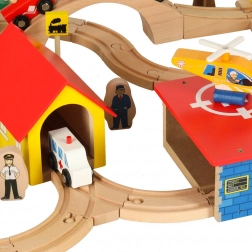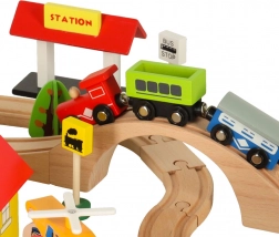 Objavte neobmedzené možnosti s touto farebnou drevenou vlakovou súpravou. Sada obsahuje stanicu, mosty, pristávaciu plochu pre helikoptéru, figúrky a ďalšie prvky, ktoré umožňujú vytvoriť svoje vlastné mestečko.