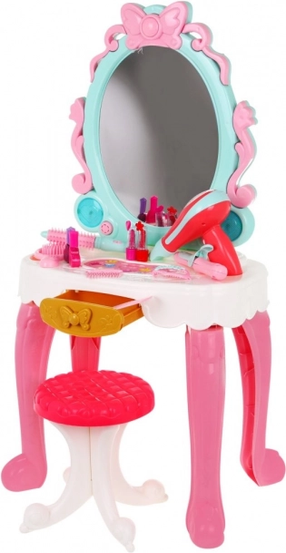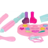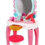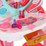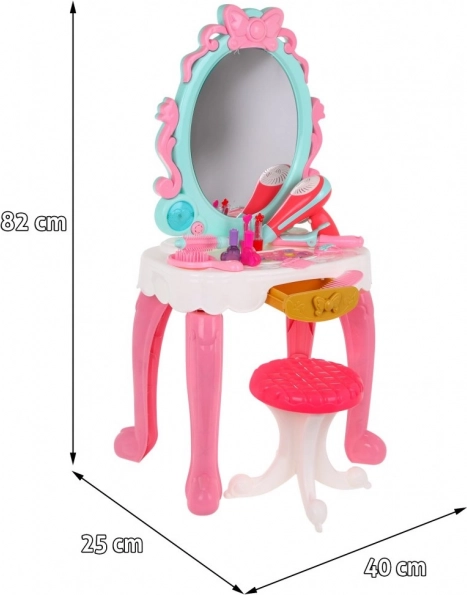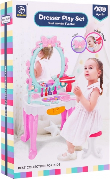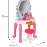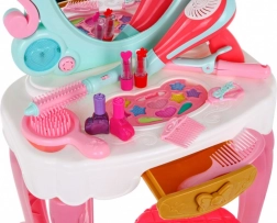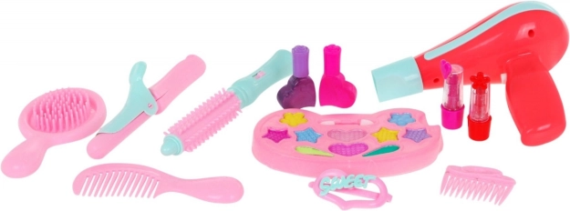 | Súčasťi sady | - toaletný stolík so zrkadlom, - stolička, - 10 x očné tiene, - štetec na očné tiene, - sušič vlasov, - hrebeň, - kefa, - žehlička na vlasy, - kulma, - 2 x sponka, - 2 x rúž, - 2 x lak na vlasy. |