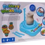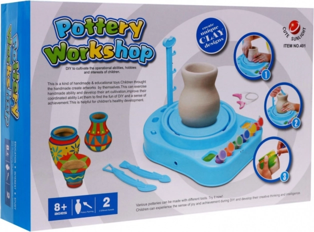 | | Sada malého hrnčiara je vzdelávacia hračka na výrobu a maľovanie keramických nádob. Deti si môžu vyrobiť vlastné hrnce, hrnčeky alebo džbány a potom ich ozdobiť farbami podľa vlastných predstáv. Keramické koleso sa otáča dvoma rýchlosťami, pomalšie a rýchlejšie. Hračka podnecuje fantáziu, rozvíja zručnosť, manuálne a výtvarné schopnosti. Hračka je vhodná pre deti od 8 rokov a má certifikát CE. Hračka je napájaná batériami typu 3 x R14 (nie sú súčasťou balenia). | Obsah sady |