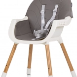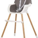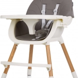 Bezpečnosť zabezpečujú 5-bodové pásy a stabilné drevené nohy s protišmykovými krytkami. Posuvný pult s odnímateľnou hornou časťou uľahčí servírovanie aj upratovanie, opierka nôh podporí správne sedenie.