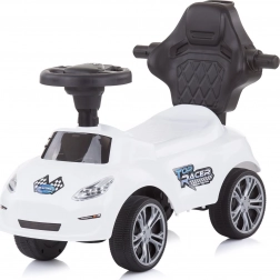 Model kladie dôraz na bezpečie a komfort: široké sedadlo s vysokým operadlom, ochranné madlá proti pádu a úložný priestor na drobnosti. Volant s melódiami podnecuje hru aj koordináciu pohybov.