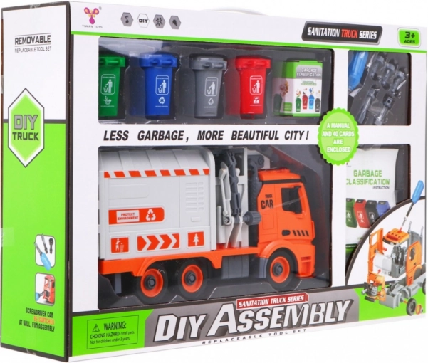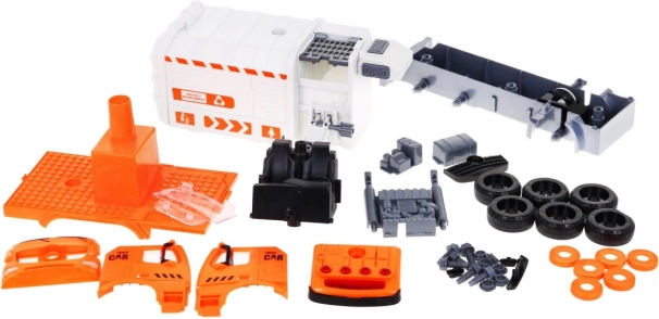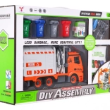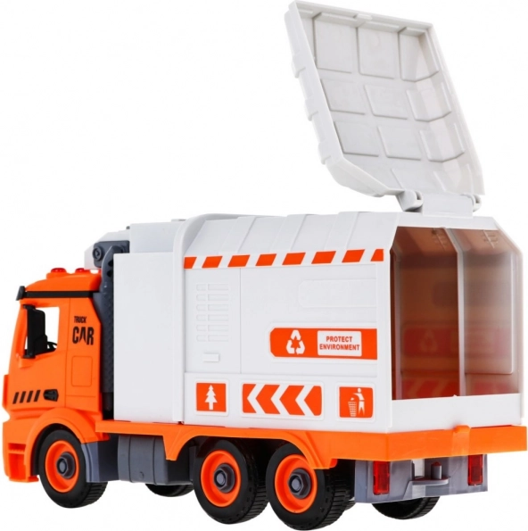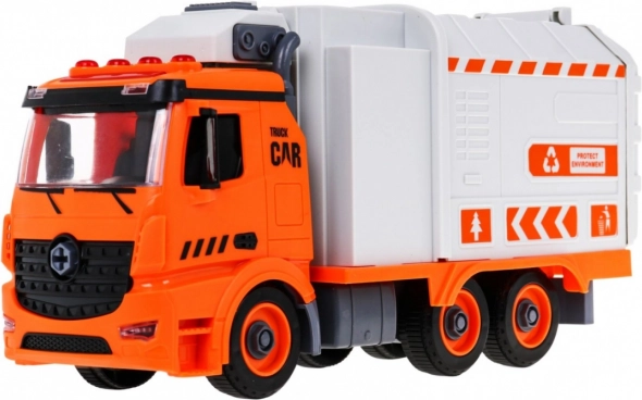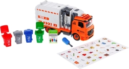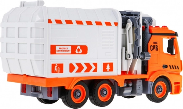 So skrutkovačom s vymeniteľnými bitmi dieťa auto rozoberie a zloží. Bočné rameno zdvíha a vysypáva kontajnery ako pri skutočnej smetiarskej súprave.