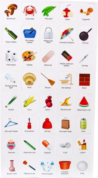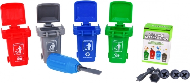 Súčasťou sady je obrázková kartičková príručka, ktorá vysvetľuje, ako správne triediť odpad: zelený – kuchynský/bio odpad, modrý – recyklovateľný odpad, sivý – zmesový odpad, červený – nebezpečný odpad. Vďaka tomu si deti prirodzene osvoja ekologické návyky a zodpovednosť k prostrediu.