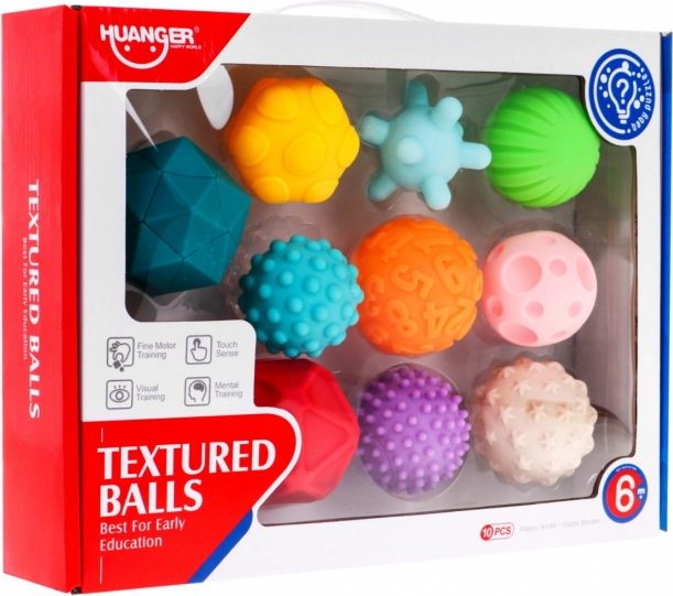 Táto univerzálna sada obsahuje 10 mäkkých gumových loptičiek s odlišnými povrchmi a tvarmi, ideálnych pre bábätká od 6 mesiacov aj staršie deti. Rôznorodé textúry podporujú hmatové vnímanie, posilňujú prsty a dlane a pomáhajú rozvíjať koordináciu ruka–oko. Pri stlačení loptičky príjemne pískajú, čo stimuluje sluch a udržiava pozornosť.