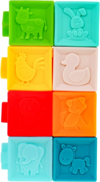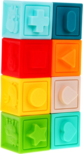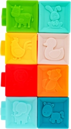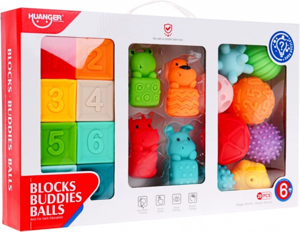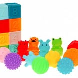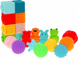 | | Súprava mäkkých, bezpečných senzorických hračiek je určená pre deti od 6 mesiacov. Hračky sú vyrobené zo 100% materiálov vhodných pre deti. Stimulujú predstavivosť, myseľ, zrak a sluch. Prvky súpravy môže dieťa voľne stláčať, čím získava silu v rukách. Pri stláčaní vydávajú zvuky, ktoré vzbudzujú záujem dieťaťa. Súprava sa skladá z 20 prvkov: obsahuje 4 zvieratká, 8 loptičiek a 8 kociek. Každý prvok má inú štruktúru a farbu, čo poskytuje dieťaťu rôzne podnety pre jeho zmysly. |