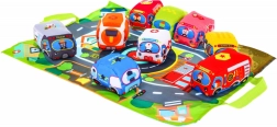 Táto univerzálna sada podporuje kreativitu a imaginatívnu hru detí od 12 mesiacov. Deväť farebných vozidiel – napríklad školský autobus, hasičské auto, sanitka, taxi, policajné vozidlo, miešačka, nákladné auto, zmrzlinár a donut truck – láka k objavovaniu mesta vytlačeného na mäkkej podložke.