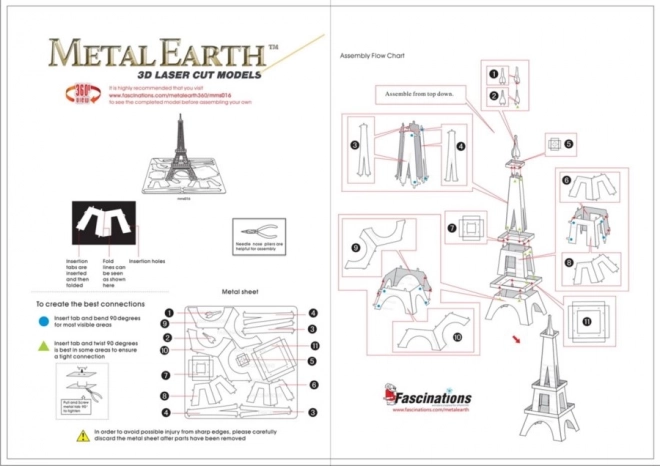 Jednotlivé diely vyberte z kovových plátkov, v prípade potreby použite malé štípacie nožnice (nie sú súčasťou). Diely sa spájajú pomocou zámkov tvorených úchytom (jazýčkom) a otvorom. Jazýček ohnite pomocou malých tenkých klieští (nie sú súčasťou) a postupne spojte všetky zámky, až vznikne veľmi realistický majstrovský kúsok!