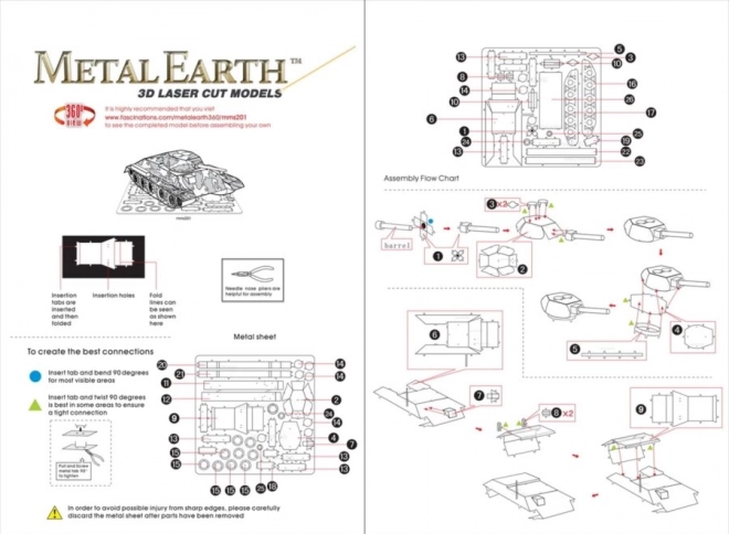 Jednotlivé diely vyberte z kovových plieškov, v prípade potreby použite malé štípacie nožnice (nie sú súčasťou). Dieliky sa spájajú pomocou zámkov tvorených úchytom (zobáčikom) a otvorom. Zobáčik ohnite pomocou malých tenkých klieští (nie sú súčasťou) a postupne spojte všetky zámky, až vznikne veľmi realistický majstrovský kúsok!