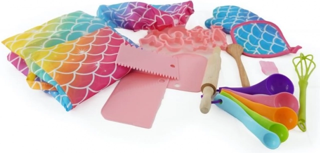 Všetko potrebné v jednom sete: zástera, čiapka, chňapka, vykrajovačky, odmerky, valček, vareška aj metlička. Deti majú všetko po ruke a môžu sa naplno sústrediť na radosť z pečenia.