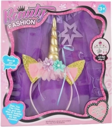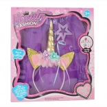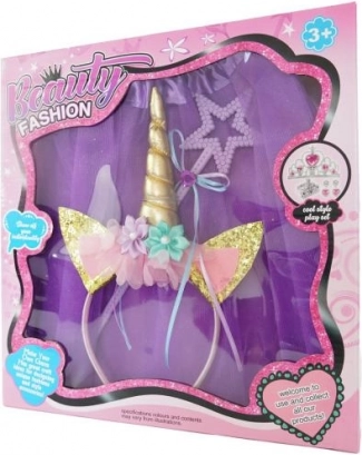 Pohodlná čelenka pevne drží a nešmýka sa. Zdobí ju zlatý roh, trblietavé ušká a farebné kvety – perfektný doplnok pre čarovný vzhľad.