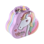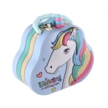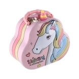 Detská plechová pokladnička v tvare kabelky s motívom jednorožca pomôže naučiť deti šetriť a počítať. Má bezpečný zámok, otvor na mince a odolné kovové prevedenie v kúzelnom pastelovom dizajne, ktorý si deti zamilujú.