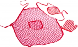 Súčasťou setu je kockovaná kuchárska zástera, chňapka a držiak na náradie, aby mali malí kuchári všetko po ruke a mohli sa pustiť do servírovania a miešania hneď po rozbalení.
