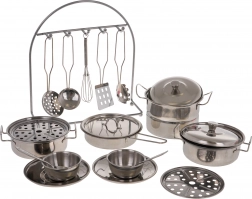 Vďaka praktickému stojanu s háčikmi majú deti všetky kovové kuchynské nástroje vždy po ruke – od naberačky a metličky po dierovanú lyžicu či obracačku. Set zahŕňa tiež tanieriky, mištičky a podložku pod hrniec, takže sa malí kuchári naučia servírovať aj hotové „pokrmy“.