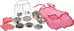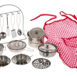 Tento bohatý kuchynský set prináša deťom autentický zážitok z varenia. Kovové hrnce, pokrievky a panvica vyzerajú aj znejú ako naozajstné, takže hra na kuchára je ešte zábavnejšia. Súčasťou je aj štýlová zástera s chňapkou v červeno-bielom kockovanom vzore pre bezpečnejšiu a čistejšiu hru.