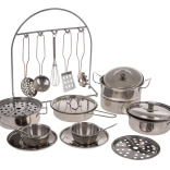 Realistický detský kuchynský set z kovu obsahuje až 23 dielov vrátane hrncov s pokrievkami, panvice, náradia, tanierikov a kuchárskeho setu so zásterou a chňapkou. Vďaka kovovému prevedeniu je výbava odolná, ľahko sa čistí a ponúka vernú hru na varenie pre deti od 3 rokov. Praktický stojan s háčikmi udržiava príslušenstvo prehľadne na dosah a podporuje rozvoj motoriky a fantázie.