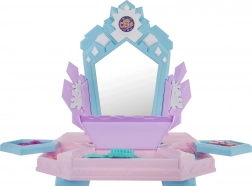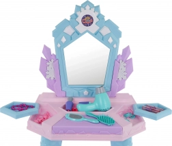 Toaletný stolík v pastelových farbách sa stane krásnou dominantou detskej izby a podporí rolové hranie, kreativitu aj jemnú motoriku. Po stlačení tlačidla na spodnej časti zrkadla sa rozsvietia svetlá a zobrazia sa princezné sprevádzané melódiami. Detský fén vydáva zvuk a má jemný prúd vzduchu, takže hra na kaderníčku je ešte realistickejšia.
