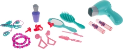 Súčasťou je bezpečný fén na 1× AA batériu, ktorý jemne fúka a vydáva realistické zvuky – ideálny na hru na kadernícky salón.