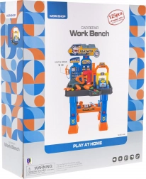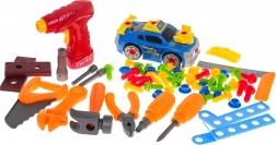 Sada obsahuje 125 dielov príslušenstva: nástroje (kladivo, píla, kliešte, kľúče), vŕtací skrutkovač na batérie, skrutky, bity, nadstavce aj dekoratívne samolepky. Autíčko možno rozoberať a upravovať, čo podporuje technické myslenie a koordináciu ruka–oko. Stabilný pracovný stolík sa ľahko montuje a je ideálny na hru doma.