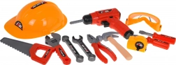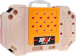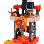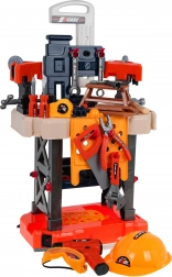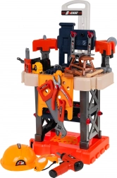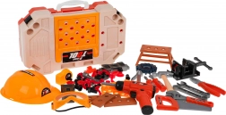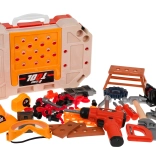 Súčasťou je široká paleta plastových nástrojov (píla, kladivo, kliešte, skrutkovače, kľúče), zverák, ozubené kolieska, spojovací materiál a ochranné vybavenie (okuliare, prilba). Deti tak bezpečne trénujú jemnú motoriku, koordináciu oko–ruka a logické myslenie, zatiaľ čo si užívajú zábavné predstierané dielenské práce.
