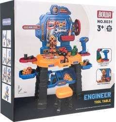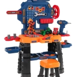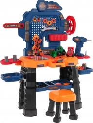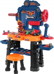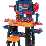 Táto farebná dielenská sada premení detskú izbu na skutočnú mini dielňu. Robustný pracovný stôl s poličkami a organizérom dopĺňa pohodlná stolička a aku vŕtačka na batérie (2× AA, nie sú súčasťou). Deti môžu skrutkovať, vŕtať a skladať vlastné projekty, vrátane dvoch stavebných vozidiel – nakladača a vyklápača.