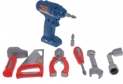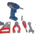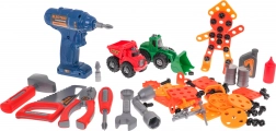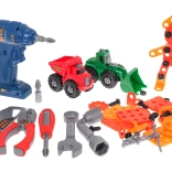 Súčasťou je široká sada nástrojov: vŕtačka s bitmi, píla, kladivko, skrutkovač, kľúče, kliešte, desiatky skrutiek, hmoždiniek a podložiek aj ozubené kolieska na prvé zoznámenie s mechanikou. Vďaka veľkému množstvu dielov a tvarových panelov si deti precvičia trpezlivosť, logiku aj koordináciu.