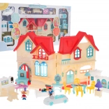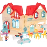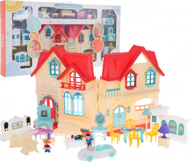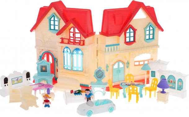 Súčasťou je bohatá sada príslušenstva: nábytok do obývačky, spálne aj kuchyne, dekorácie, auto s pohyblivými kolesami a tri figúrky (maminka, otecko, dieťa). Vďaka jednoduchému rozkladaniu a otváracím dverám je hranie prehľadné a pohodlné.
