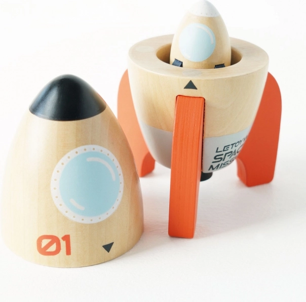 Sada vesmírnych rakiet od Le Toy Van je ideálnym darčekom pre malých prieskumníkov. Táto drevená sada obsahuje dve rakety - jednu väčšiu s otváracím magnetickým vekom a menšiu raketu vnútri. Všetky komponenty sú vyrobené z FSC certifikovaného dreva a pomalované netoxickými farbami na vodnej báze, čo ich robí bezpečnými pre deti.