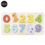 Toto drevené vkladacie puzzle podporuje rané učenie a rozvíja vzťah k číslam od útleho veku. Dieťa vkladá robustné číslice na správne miesta, môže sa riadiť tvarom alebo počítať bodky na základni. Hravé učenie prirodzene rozvíja jemnú motoriku, koordináciu oko–ruka aj logické myslenie.