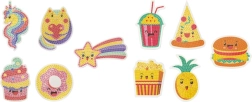 - zvieratká a jedlo (napr. jednorožec, mačka, hviezda, donut, cupcake, pizza, burger, popcorn, nápoj, ananás)