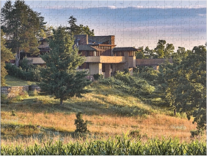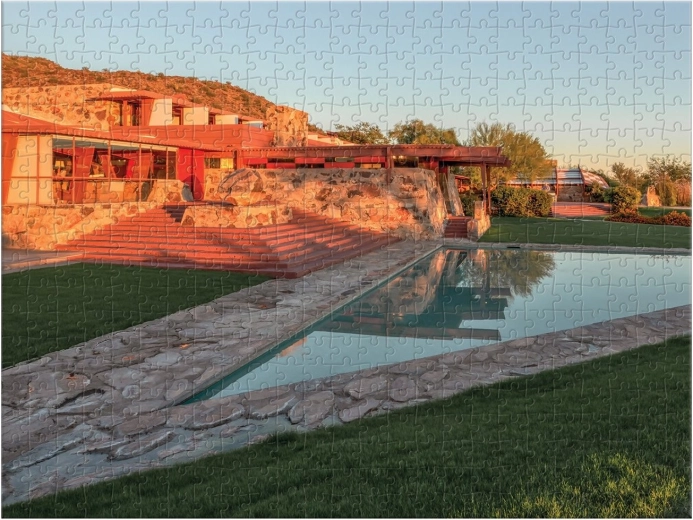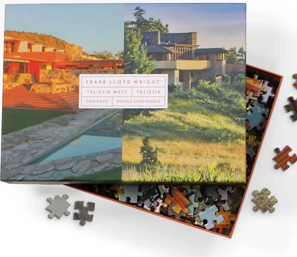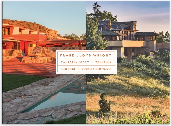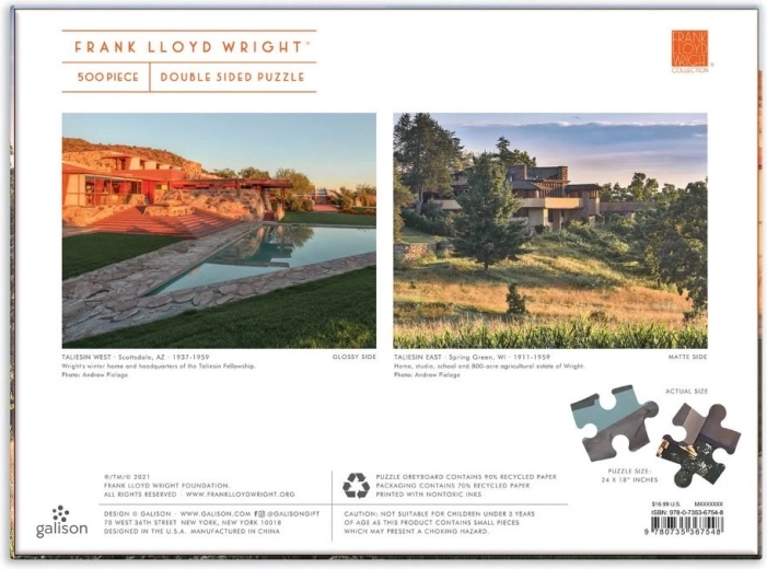 Objavte dve majstrovské diela v jednom balení. Toto obojstranné puzzle prináša pôsobivé zábery ikonických stavieb Taliesin a Taliesin West, spojených s menom vizionárskeho architekta FRANK LLOYD WRIGHT. Vďaka rozdielnej povrchovej úprave – lesk z jednej strany a mat z druhej – je skladanie prehľadné, zábavné a vhodné pre široké spektrum milovníkov puzzle.
