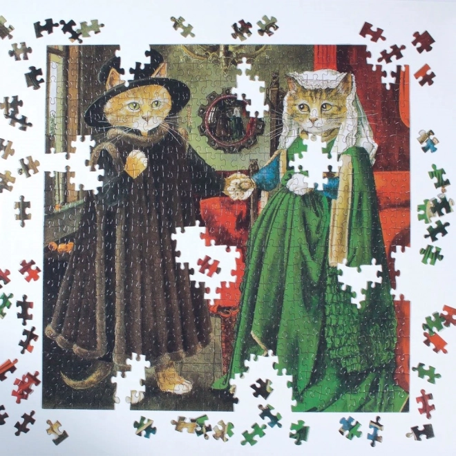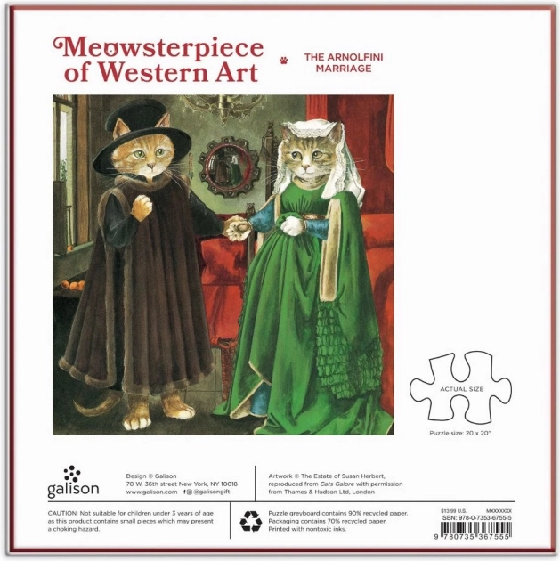 Vstúpte do sveta umenia s úsmevom. Puzzle Meowsterpiece: Arnolfiniho manželstvo prináša mačacie poňatie slávneho obrazu Jana van Eycka v podaní Susan Herbert. Vďaka 500 starostlivo spracovaným dielikom a štvorcovému formátu vznikne po zložení obraz s rozmerom cca 51 × 51 cm, ktorý vynikne na stole aj na stene.