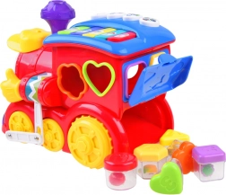 Súčasťou sady sú barety a číslované kocky, ktoré dieťa priraďuje do príslušných otvorov na lokomotíve. Každý blok obsahuje ovocie a číslo alebo písmeno, ktoré prispievajú k vzdelávaniu. Vďaka týmto interaktívnym prvkom sa lokomotíva stáva skvelým nástrojom na rozvoj motorických zručností a logického myslenia.