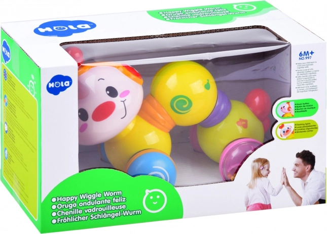 Interaktívna jazdiaca húsenica Happy Wiggle Worm je ideálna hračka pre bábätká a batoľatá. Po stlačení chrbta sa húsenica natiahne a vyrazí vpred po rovnom povrchu, zatiaľ čo hlavička mení farby a znejú príjemné melódie. Otočná hlava podporuje zvedavosť a jemnú motoriku.
