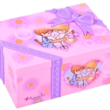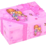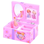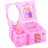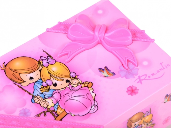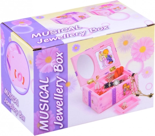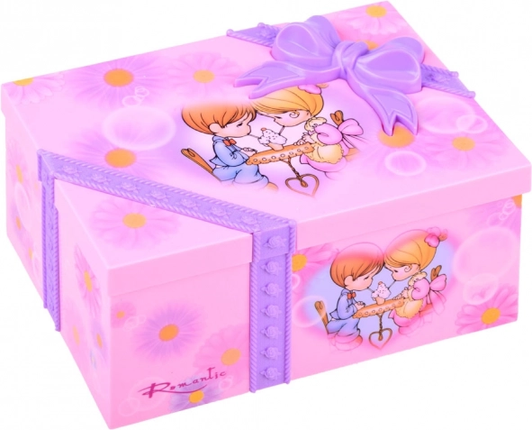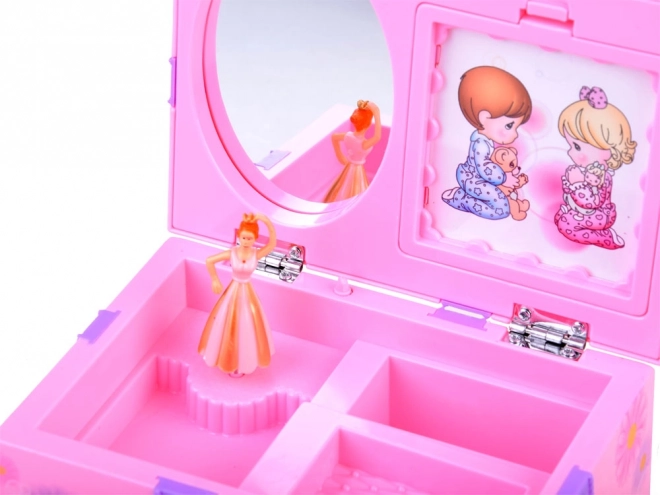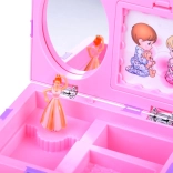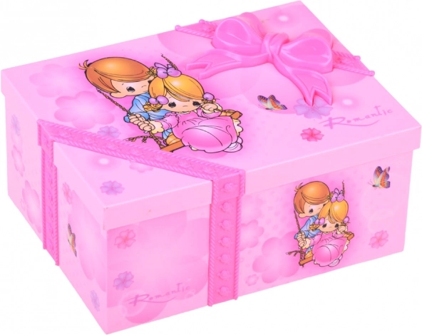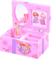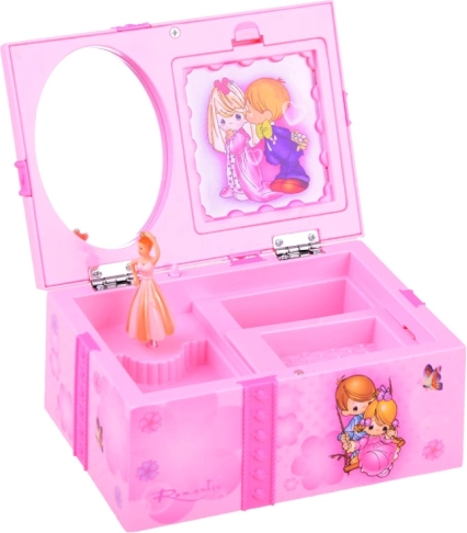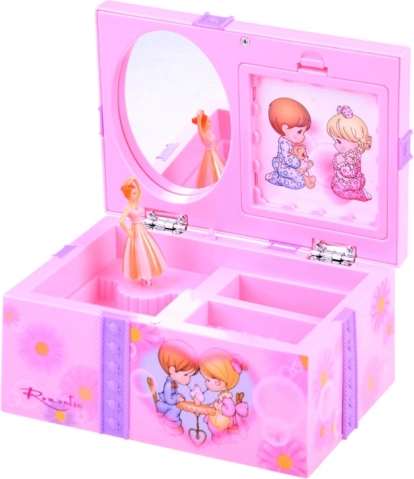 Táto pôvabná šperkovnica v ružových tónoch je zdobená kvetmi a milými ilustráciami dievčatka a chlapca. Po otvorení sa roztočí balerína a spustí sa príjemná melódia, ktorá navodí rozprávkovú atmosféru pri každodennom zdobení a ukladaní šperkov.