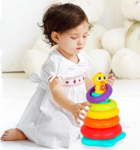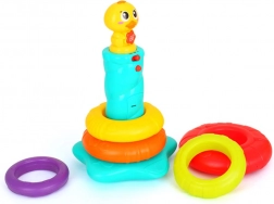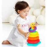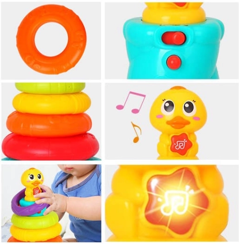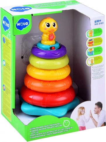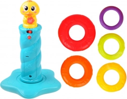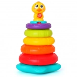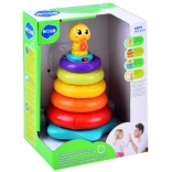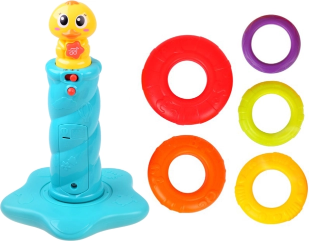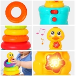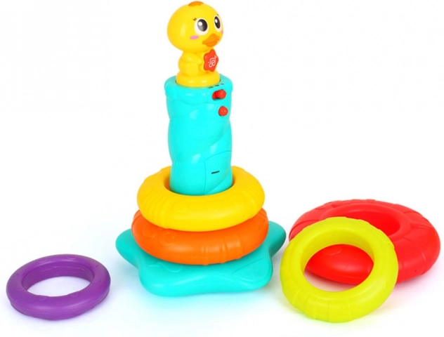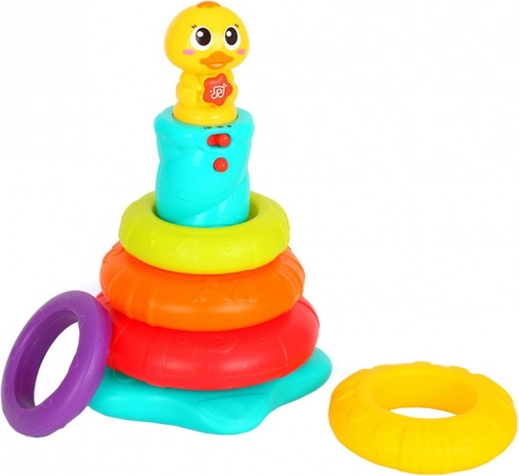 Interaktívna skladacia veža s káčatkom prináša deťom radosť z objavovania. Päť farebných krúžkov sa nasádza na stabilnú tyč s hlavou káčatka, ktoré pri hre vydáva zábavné zvuky a kvačanie a rozsvieti blikajúce svetielko. Keď sa dieťa chvíľu nehrá, káčatko sa veselými zvukmi pripomenie a vyzve k skúmaniu.