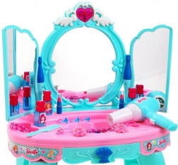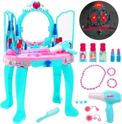 Interaktívny toaletný stolík poteší malé milovníčky módy a krásy. Je vyrobený z pevných a bezpečných materiálov v jemných pastelových odtieňoch ružovej a tyrkysovej, vďaka čomu pôsobí priateľsky a elegantne. Stlačením srdiečka nad zrkadlom sa aktivujú jemné LED svetielka a melódie, ktoré navodia čarovnú atmosféru.