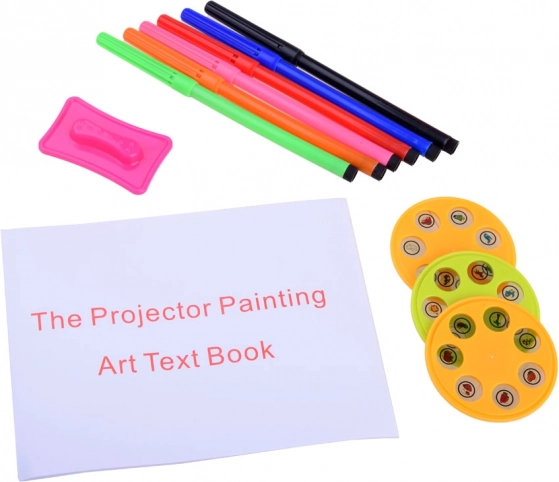 - Všetko v jednom – 6 fixiek, 3 disky so vzormi, zošit na maľovanie, hubka a projektor.