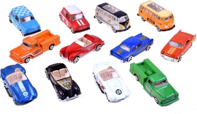 Štýlová sada 12 modelov pre malých aj veľkých fanúšikov áut: každé auto má kovovú karosériu (die-cast), plastový podvozok a mierku 1:64. Rôzne farby a tvary v retro štýle, rozmer jedného auta 8 × 3,5 × 3 cm. Skvelá voľba pre deti od 3 rokov aj zberateľov.