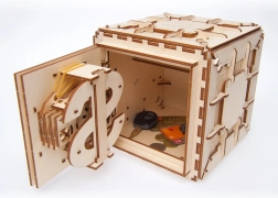 Súčasťou je kombinačný zámok s možnosťou nastavenia vlastného kódu (z výroby 3–2–1). Trezor je ideálny na uloženie drobností, mincí či kariet a zároveň ako štýlová dekorácia aj edukačná pomôcka na pochopenie princípov mechaniky. Odporúčané pre staviteľov od 14 rokov.