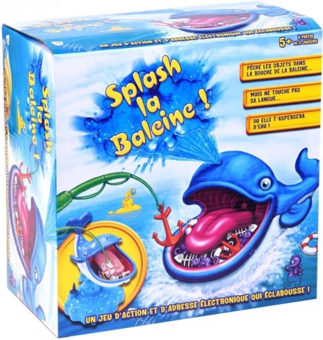 Hra vodná veľryba je skvelá interaktívna zábava pre celú rodinu. Deti si precvičia jemnú motoriku, trpezlivosť aj oko–ruka koordináciu, zatiaľ čo súťažia v lovení kotvy, záchranných kruhov či rybích kostier priamo z tlamy usmievavej veľryby. Ale pozor – dotyk jazyka spustí vodnú spršku!