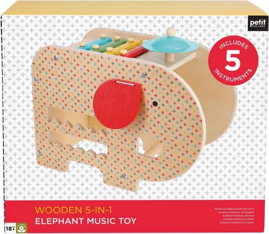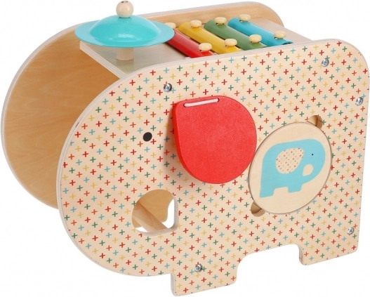 Slon ponúka päť hudobných nástrojov v jednom: xylofón, bubienok, činel a ďalšie pre rozvoj kreatívneho hudobného vyjadrenia.