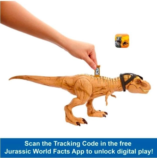Po stlačení tlačidla T‑Rex otvorí tlamu a otočí hlavu do strany, čo verne napodobňuje filmové scény z Jurassic World. Naskenovaním skrytého DNA tagu v aplikácii Jurassic World Facts odomknete rozšírené informácie a herné výzvy.