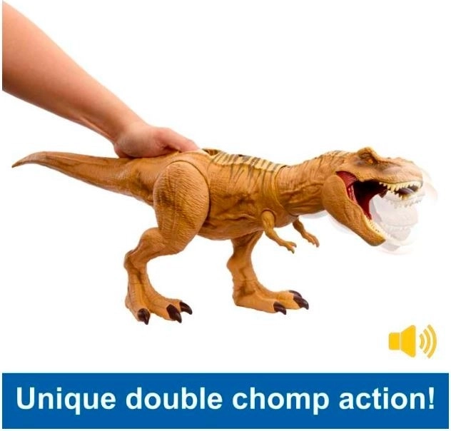 Stlačením tlačidla T‑Rex otvorí tlamu a otočí hlavu do strany, sprevádzané realistickým dinosauřím revom inšpirovaným filmami Jurassic World.