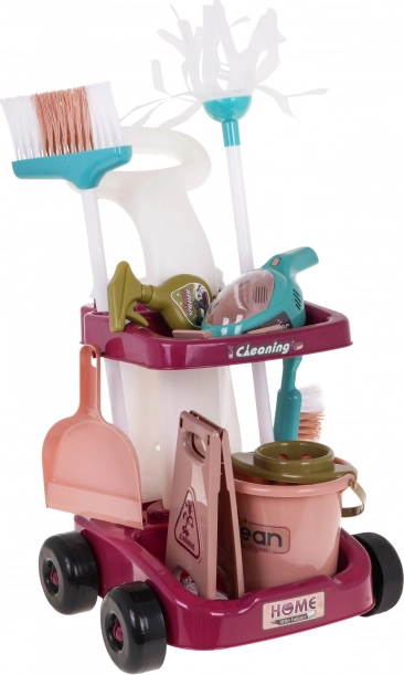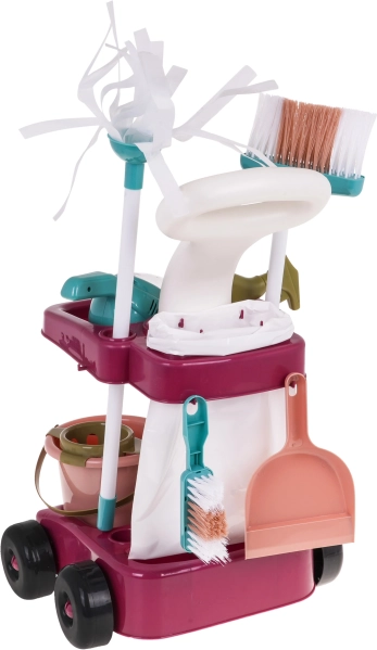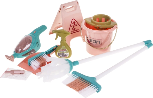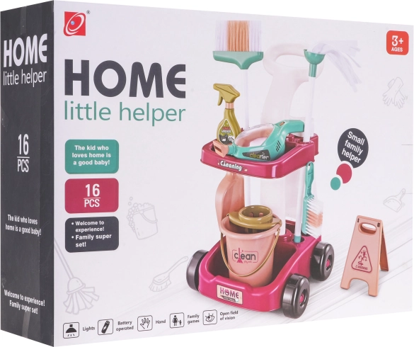Veľká upratovacia sada s ručným vysávačom a vozíkom na príslušenstvo je vhodná pre deti od 3 rokov. Sada bola vyrobená s dôrazom na detail z najkvalitnejších materiálov a je pre dieťa úplne bezpečná. Vozík má veľké kolieska, pohodlnú rukoväť na tlačenie a dve police na uloženie všetkého upratovacieho príslušenstva. Súčasťou sady je veľa príslušenstva, napríklad vedro na mop, kefka, lopatka a metlička, atrapa umývacieho stroja, ručný vysávač na batérie, polystyrénové guličky, plastové vrecko na odpadky a výstražná tabuľa. Ručný vysávač je napájaný 3 x AA 1,5V batériami, batérie nie sú súčasťou balenia. Má zvukové a svetelné funkcie, vymeniteľné nástavce a skutočne vysáva polystyrénové guličky, ktoré sú súčasťou sady. Pri vysávaní sú počuteľné zvuky typické pre danú činnosť a vnútro vysávača je osvetlené.